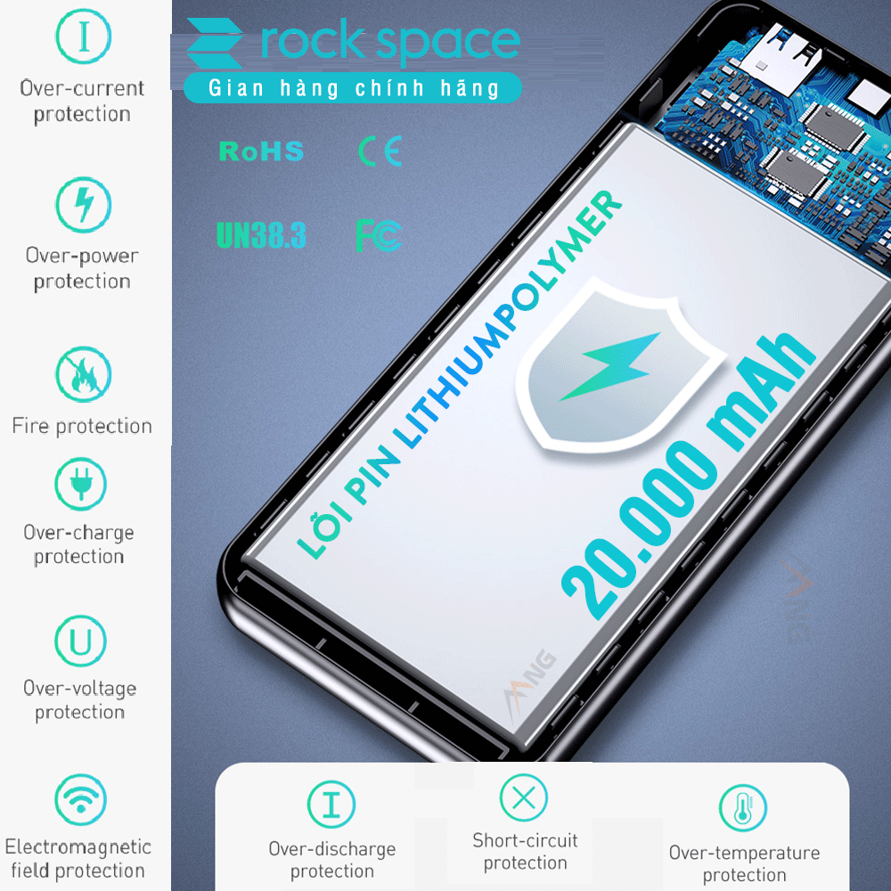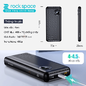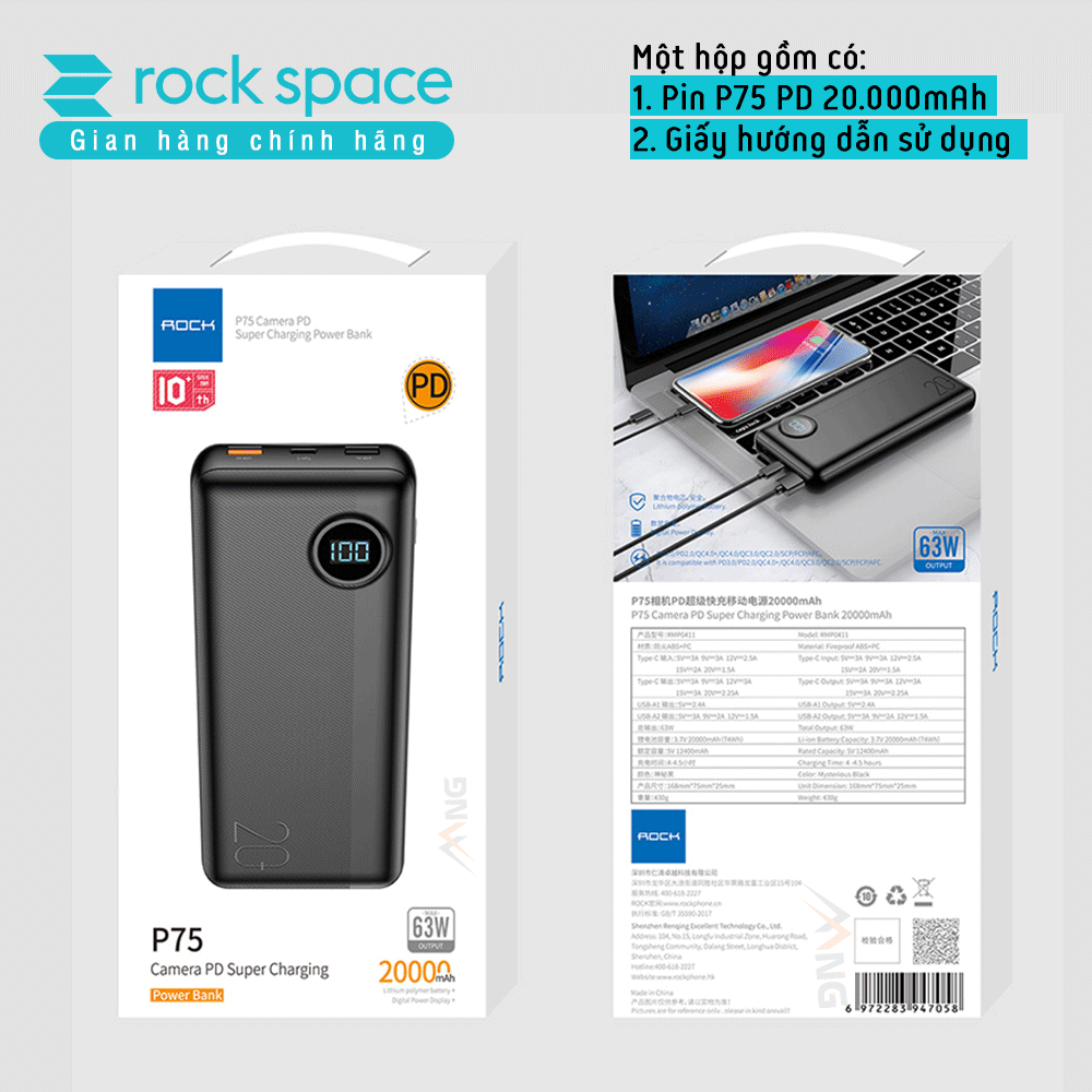 Sạc dự phòng Rockspace P75 20.000 mAh 63W sạc nhanh chuẩn PDĐơn vị tính : Cái Tình trạng : Mới Thông tinPin phòng Rock P75 super charger 63W - 20.000 mAh hỗ trợ sạc nhanh chuẩn PD, QC Lõi pin lithiumpolymer siêu bền,dung lượng 20.000 mAh Hỗ trợ sạc nhanh chuẩn QC2.0,3.0 cho android - các dòng Samsung,Oppo,... Hỗ trợ sạc nhanh chuẩn PD ... Màu sắcTag :